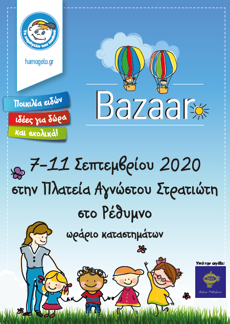 Πλατεία Αγνώστου Στρατιώτη Ρέθυμνο«Το Χαμόγελο του Παιδιού» προσκαλεί τους φίλους και υποστηρικτές του να επισκεφτούν το bazaar που διοργανώνει στο Ρέθυμνο, στην Πλατεία Αγνώστου Στρατιώτη, από τη Δευτέρα 7 Σεπτεμβρίου έως και την Παρασκευή 11 Σεπτεμβρίου (ωράριο καταστημάτων)