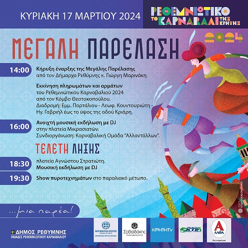 Πραγματοποιήθηκε την Πέμπτη 14 Μαρτίου 2024 στην ολομέλεια του Ο.Ρ.Κ. η κλήρωση για την σειρά εμφάνισης των ομάδων στην μεγάλη παρέλαση του Ρεθεμνιώτικου Καρναβαλιου την Κυριακή 17 Μαρτίου 2024.