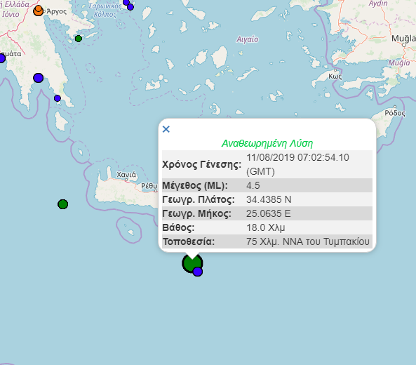 Σύμφωνα με την ανακοίνωση του Γεωδυναμικού Ινστιτούτου του Εθνικού Αστεροσκοπείου Αθηνών το επίκεντρο της δόνησης εντοπίζεται στο θαλάσσιο χώρο 75 Χλμ. νότια-νοτιοανατολικά του Τυμπακίου.