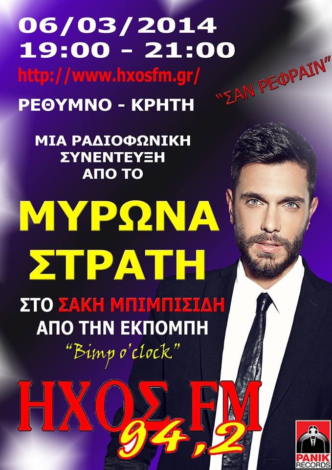 Ο Μύρωνας Στρατής θα είναι καλεσμένος στον «Ήχος Fm 94.2» και στην εκπομπή «Bimb o' clock», που επιμελείται και παρουσιάζει ο Σάκης Μπιμπισίδης, την Πέμπτη 6 Μαρτίου 2014, 19:00-21:00!