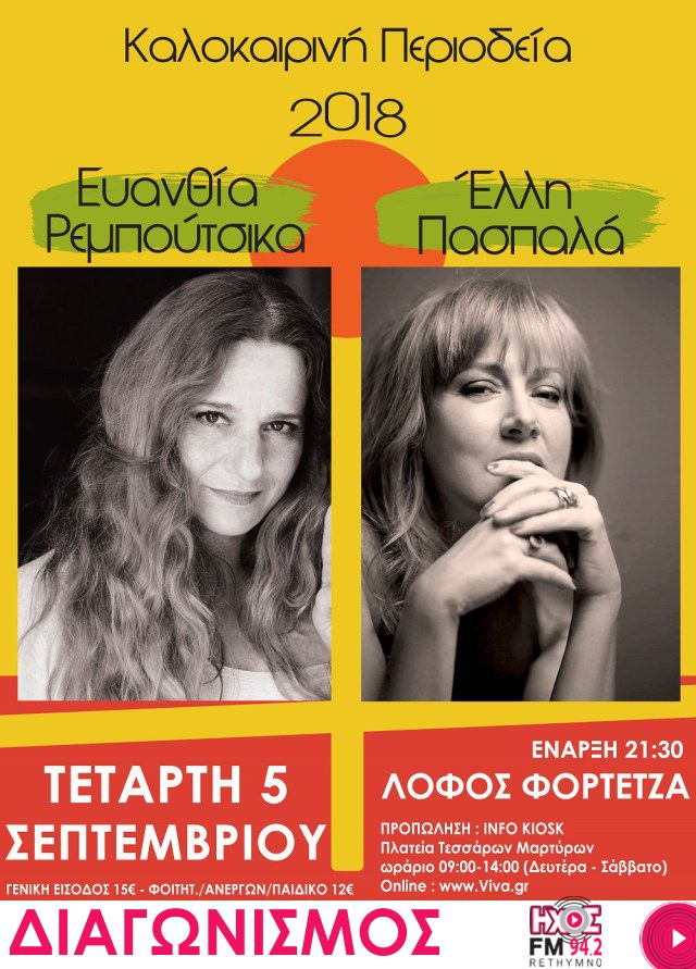 Η Ευανθία Ρεμπούτσικα και η Έλλη Πασπαλά, έρχονται στο Ρέθυμνο και ο «Ήχος Fm 94.2» δίνει τη δυνατότητα σε δύο τυχερούς ακροατές να κερδίσουν από μία διπλή πρόσκληση και να παρακολουθήσουν τη συναυλία δωρεάν την Τετάρτη 5 Σεπτεμβρίου, στο λόφο Φορτέτζα!