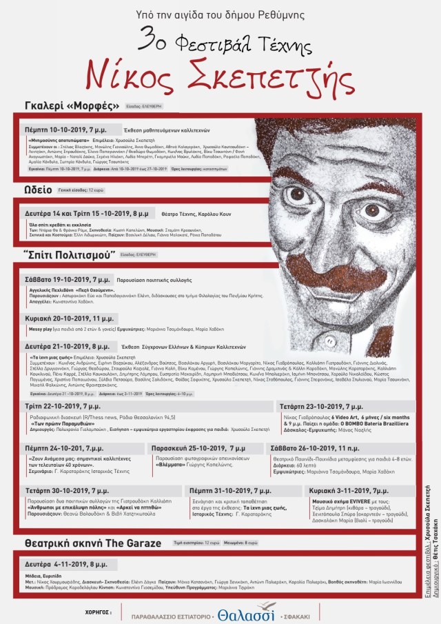 Η έκθεση θα εγκαινιαστεί την Δευτέρα 21 Οκτωβρίου, ώρα 20:00 και συμμετέχουν οι εξής καλλιτέχνες: Κωνσταντίνος Ανδρώνης, Ειρήνη Βαζούκου, Αλέξανδρος Βούτσας, Βασιλάκου Αργυρή, Βασιλάκου Μαργαρίτα, Νίκος Γιαβρόπουλος, Καλλιόπη Γιατρουδάκη, Γιάννης Διαλινός, Στέλλα Δρυγιαννάκη, Γιώργος Θεοδώρου, Σταυρούλα Καζιαλέ, Γιάννα Καλή, Βίκυ Καμένου, Γιώργης Καπελώνης, Κάλλη Καραδάκη και Γιάννης Δραμιτινός, Μανώλης Καραταράκης, Καλλιόπη Κουκλινού, Πένυ Κορρέ, Στέλλα Κουκουλάκη, Δημήτρης Λάμπρου, Ευστρατία Μαχαιρίδη, Λαμπρινή Μποβιάτσου, Κωνσταντίνα Μπολιεράκη, Ισμήνη Μπονάτσου, Χαρούλα Νικολαϊδου, Κώστας Παγωμένος, Χριστίνα Παπαιωάνου, Σύλβια Πετσούρα, Βασίλης Σολιδάκης, Φοίβος Σοφικίτης, Χρυσούλα Σκεπετζή, Νίκος Σταθόπουλος, Γιάννης Στεφανάκις, Ισαβέλα Στυλιανού, Μαρία Τσουκνάκη, Μιχαήλ Φαλκώνης, Αντώνης Φραντζεσκάκης.