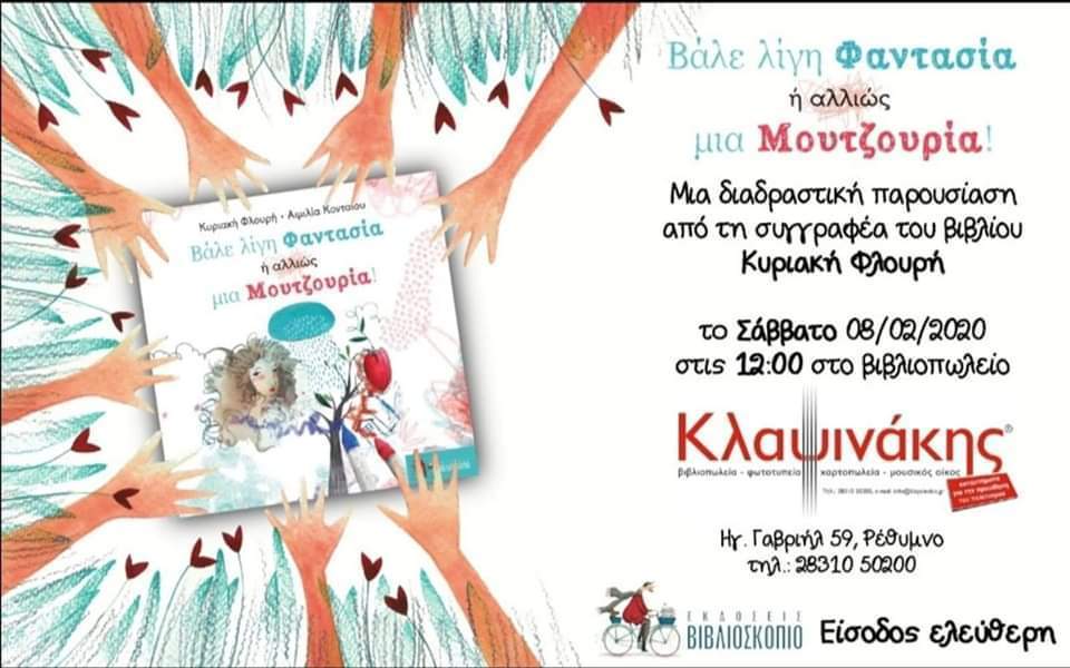 Αγαπημένα μας παιδιά, το Σάββατο 8 Φεβρουαρίου 2020 στις 12:00 π.μ., σας περιμένουμε στην διαδραστική παρουσίαση του βιβλίου “ Βάλε λίγη Φαντασία ή αλλιώς μια Μουτζουρία ! ”, (εκδ. Βιβλιοσκόπιο), που έγραψε η αγαπημένη μας Κυριακή Φλουρή και εικονογράφησε η εκπληκτική Αιμιλία Κονταίου.
