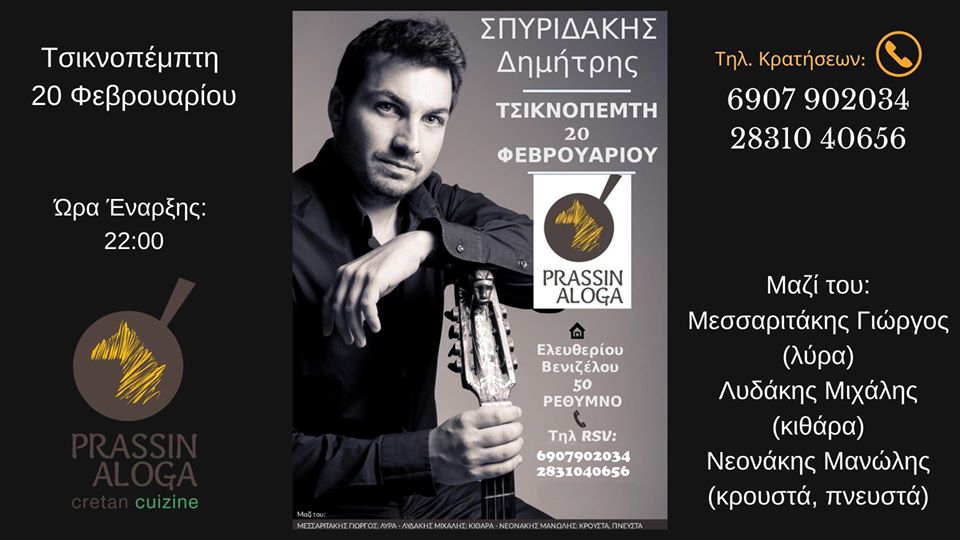 Την Τσικνοπέμπτη, 20/2, σας περιμένουμε να ξεφαντώσουμε και να τσικνίσουμε παρέα με τον Δημήτρη Σπυριδάκη (Δημήτρης Σπυριδάκης) και το συγκρότημά του! Πού αλλού; Prassin Aloga!