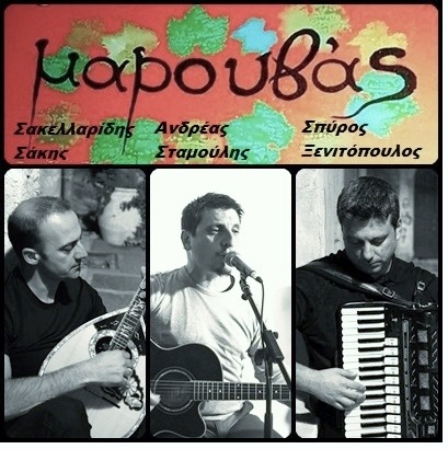 Ο Σάκης Σακελλαρίδης (μπουζούκι), ο Ανδρέας Σταμούλης (κιθάρα) και ο Σπύρος Ξενιτόπουλος (ακορντεόν) σε μία μουσική βραδιά στο Οινομαγειρείο Μαρουβάς (Βερνάδου 32, Παλαιά Πόλη, Ρέθυμνο).