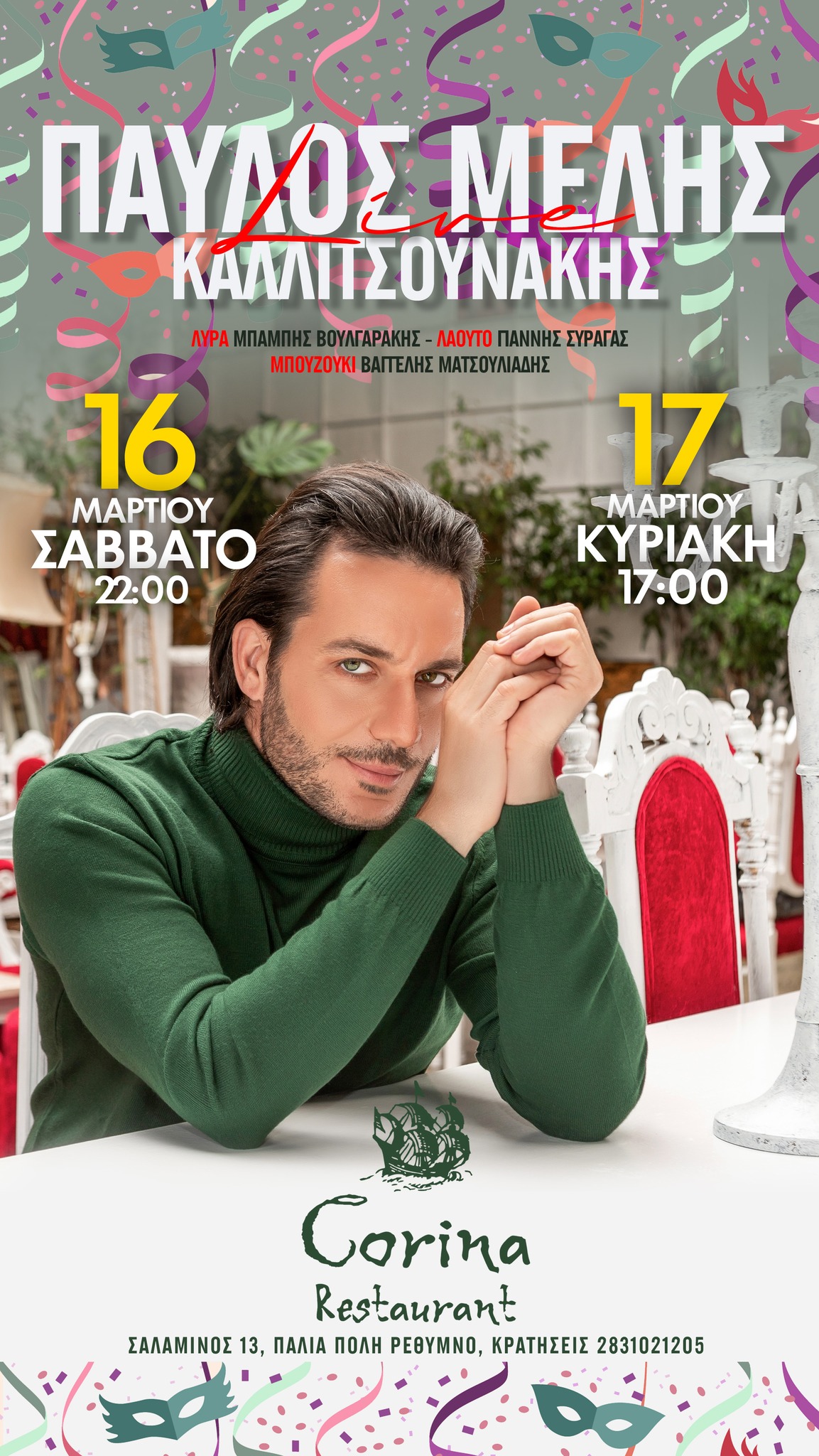 To Σαββατόβραδο, παραμονή καρναβαλιού, και την Κυριακή του καρναβαλιού (από το απόγευμα) super live στο Corina Restaurant με τον Παύλο Μελή και το συγκρότημά του!
