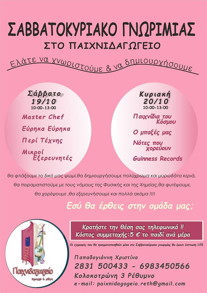 Το Σάββατο 19 Οκτωβρίου και την Κυριακή 20 Οκτωβρίου στο χώρο του Παιχνιδαγωγείου (Κέντρο Δημιουργικής Απασχόλησης Παιδιών Ρεθύμνου) στην οδό Κολοκοτρώνη 3, προσκαλούμε όλα τα παιδάκια για να γνωριστούμε και να δημιουργήσουμε παρέα!