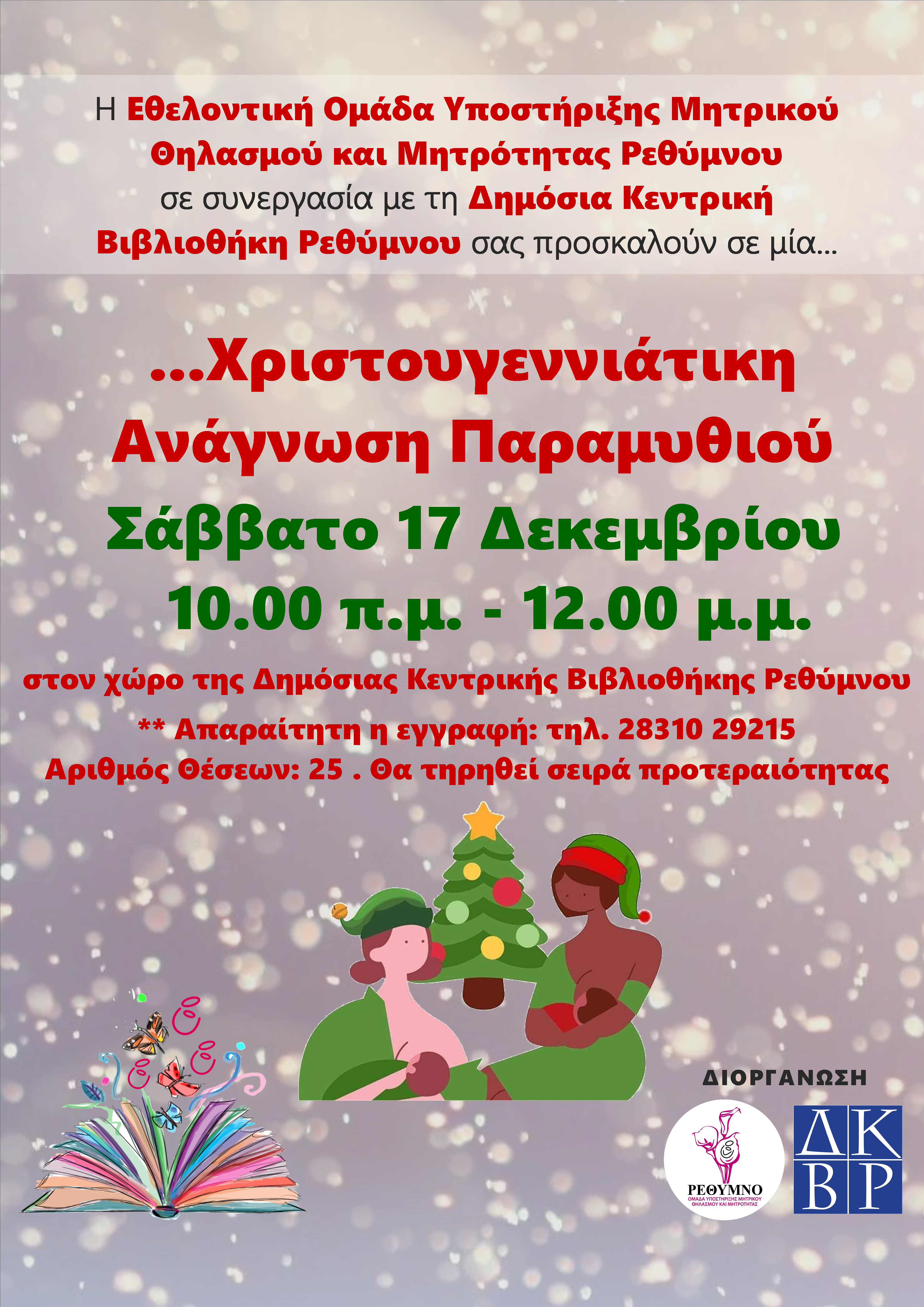 Η Εθελοντική Oμάδα Υποστήριξης Μητρικού Θηλασμού και Μητρότητας Ρεθύμνου σε συνεργασία με τη Δημόσια Κεντρική Βιβλιοθήκη Ρεθύμνου σας προσκαλούν σε μία…