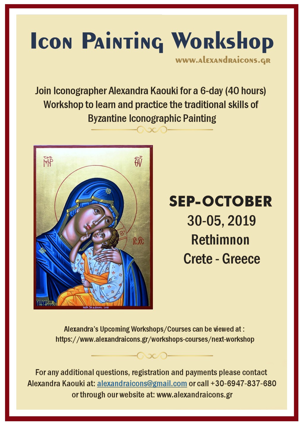 The Icon workshop is held in Rethymno at Crete, from Monday 30th Sep to Saturday 05th Oct 2019.
