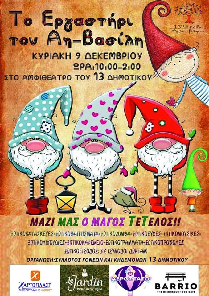 Ο Σύλλογος Γονέων και Κηδεμόνων και ο Σύλλογος Διδασκόντων του 13ου Δημοτικού σχολείου Ρεθύμνου, οργανώνουν και φέτος το «Εργαστήριο του Άι Βασίλη», την Κυριακή 9 Δεκεμβρίου στο χώρο του 13ου Δημοτικού σχολείου (Μασταμπάς).
